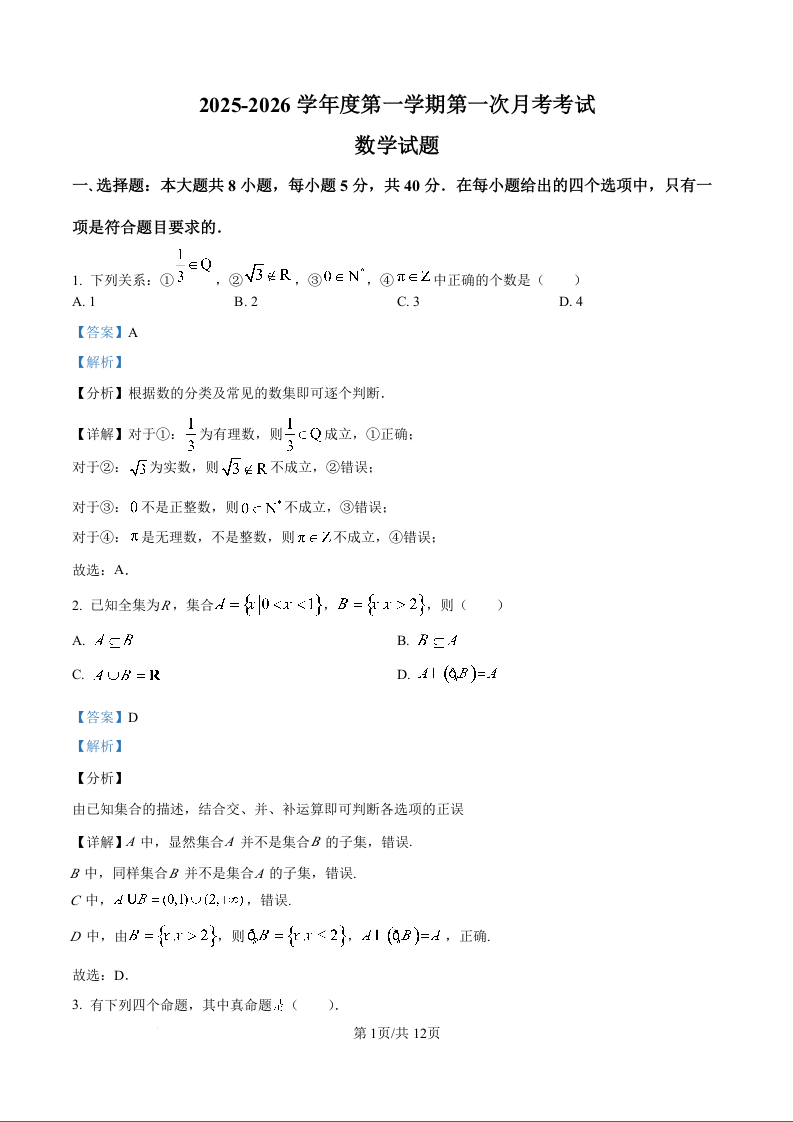 高一数学(精品解析版)--黑龙江省牡丹江市第二高级中学2025-2026学年高一上学期9月月考试题