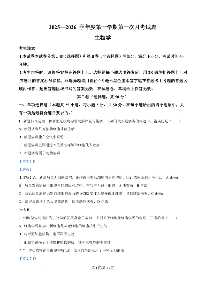 高一生物(精品解析版)--黑龙江省牡丹江市第二高级中学2025-2026学年高一上学期9月月考试题