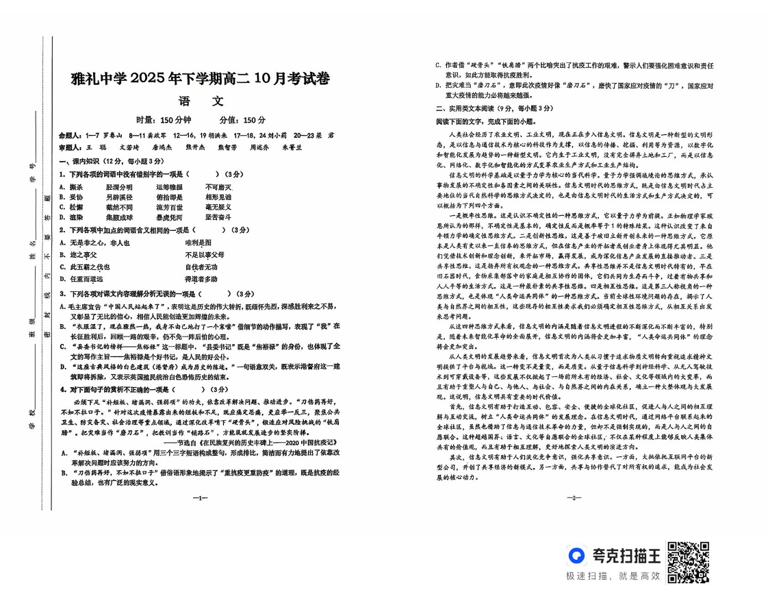 高二语文--湖南省长沙市雅礼中学2025-2026学年高二上学期第一次(10月)质量检测