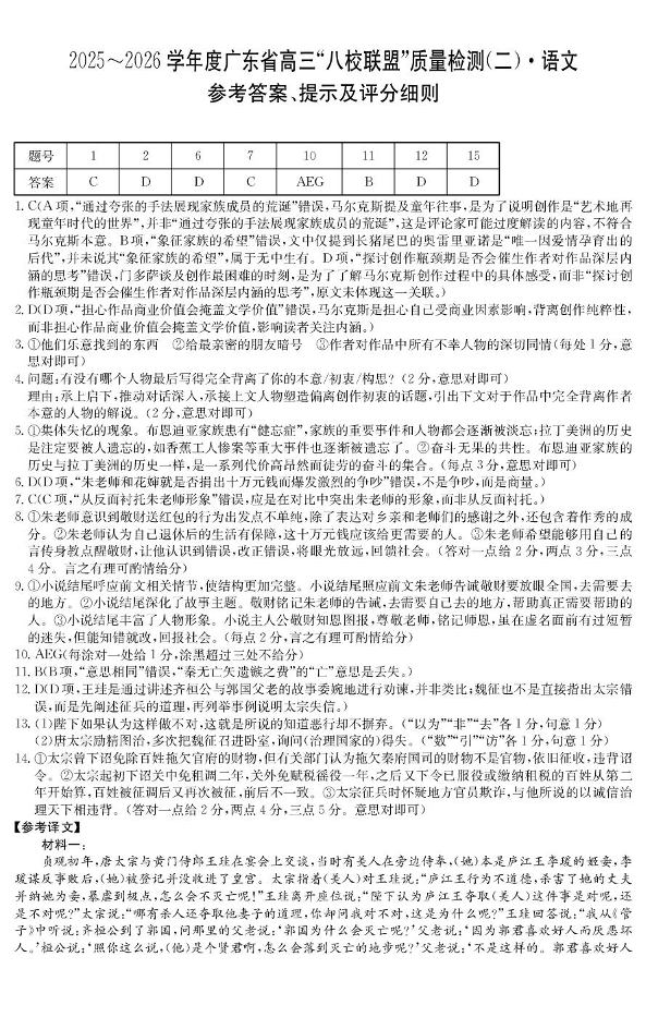 高三语文答案--广东省八校联盟2026届高三上学期质量检测(二)