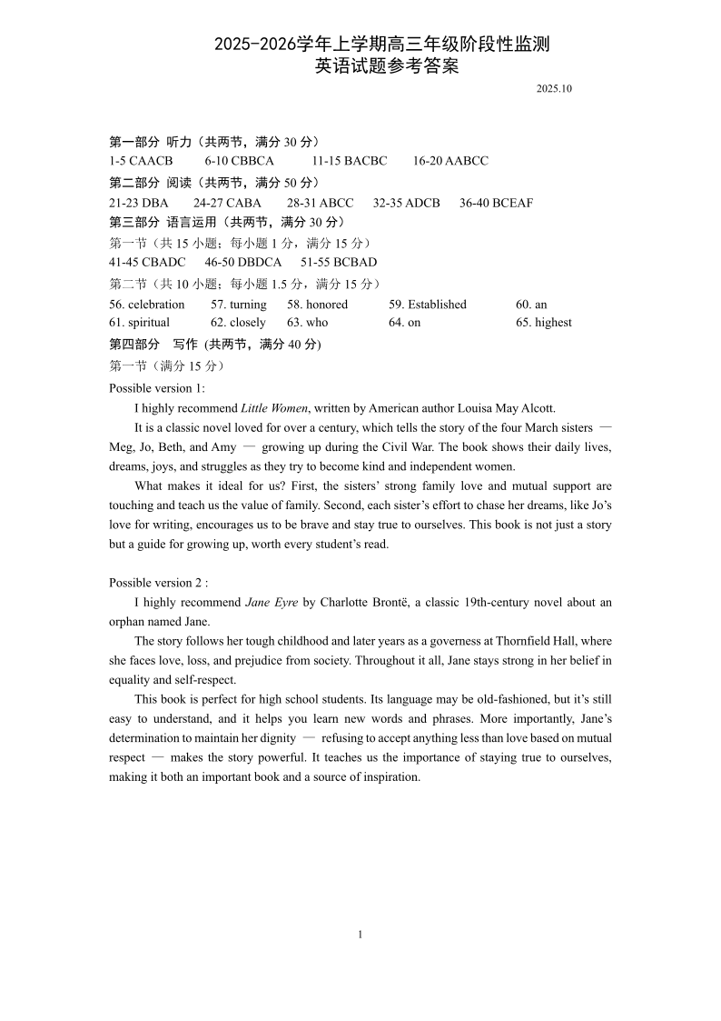 高三英语答案--潍坊部分区域2025.10高三阶段性统考