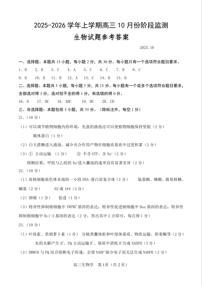高三生物答案--潍坊部分区域2025.10高三阶段性统考