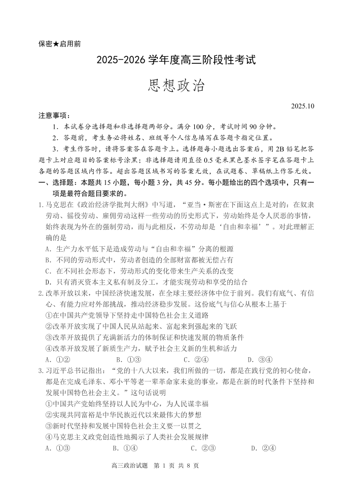 高三政治--潍坊部分区域2025.10高三阶段性统考