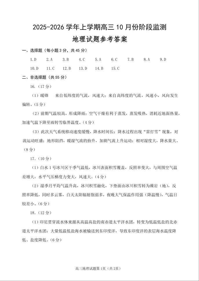 高三地理答案--潍坊部分区域2025.10高三阶段性统考