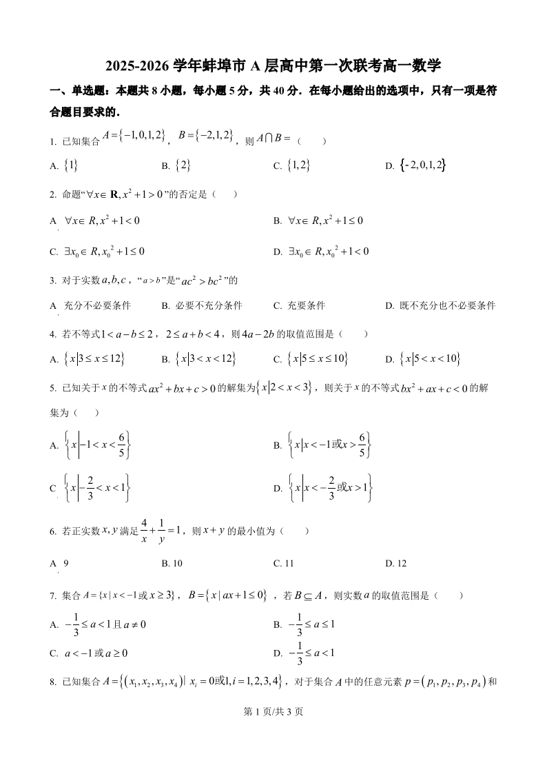 高三数学(原卷版)--安徽省蚌埠市A层高中2025-2026学年高一上学期10月月考