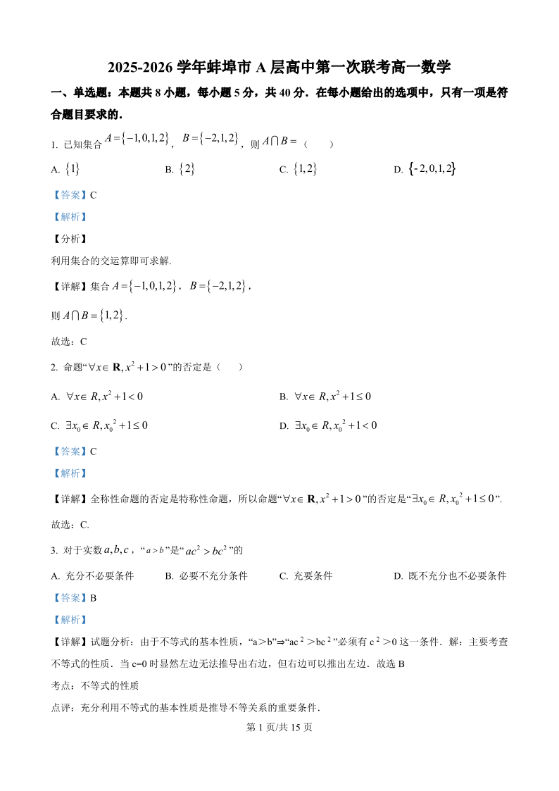高三数学(精品解析版)--安徽省蚌埠市A层高中2025-2026学年高一上学期10月月考