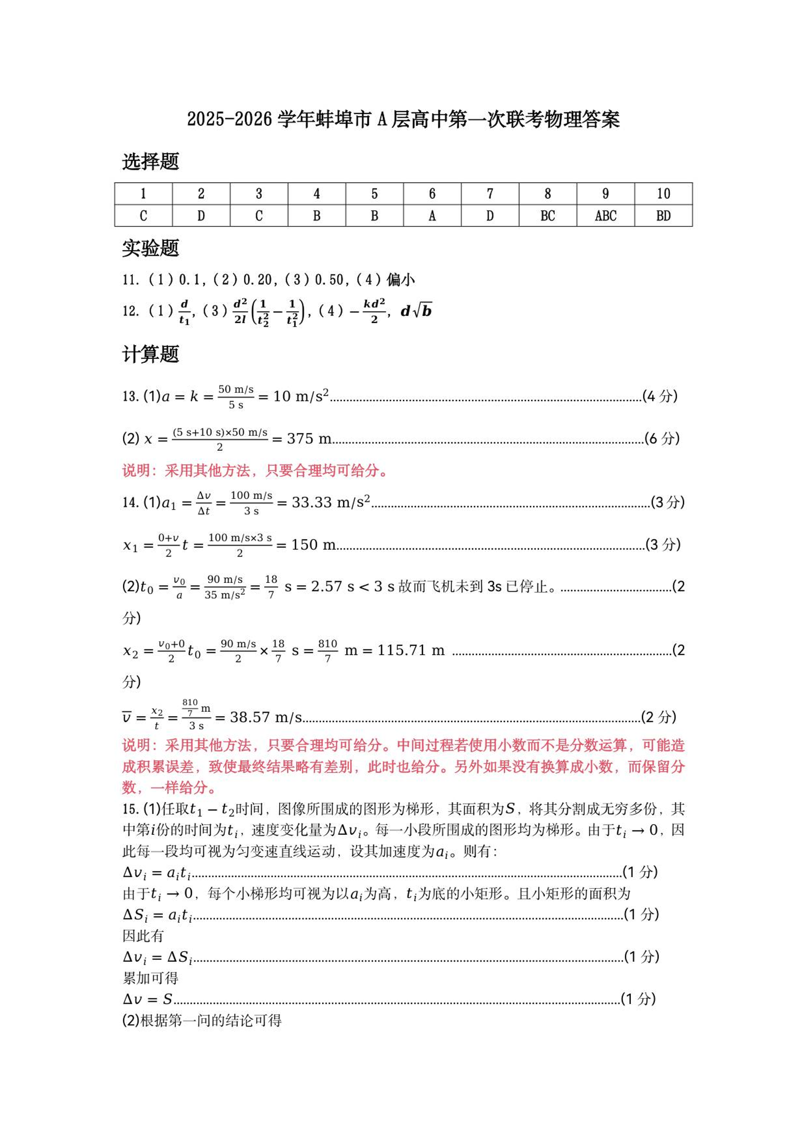 高一物理答案--安徽省蚌埠市A层高中2025-2026学年高一上学期10月月考