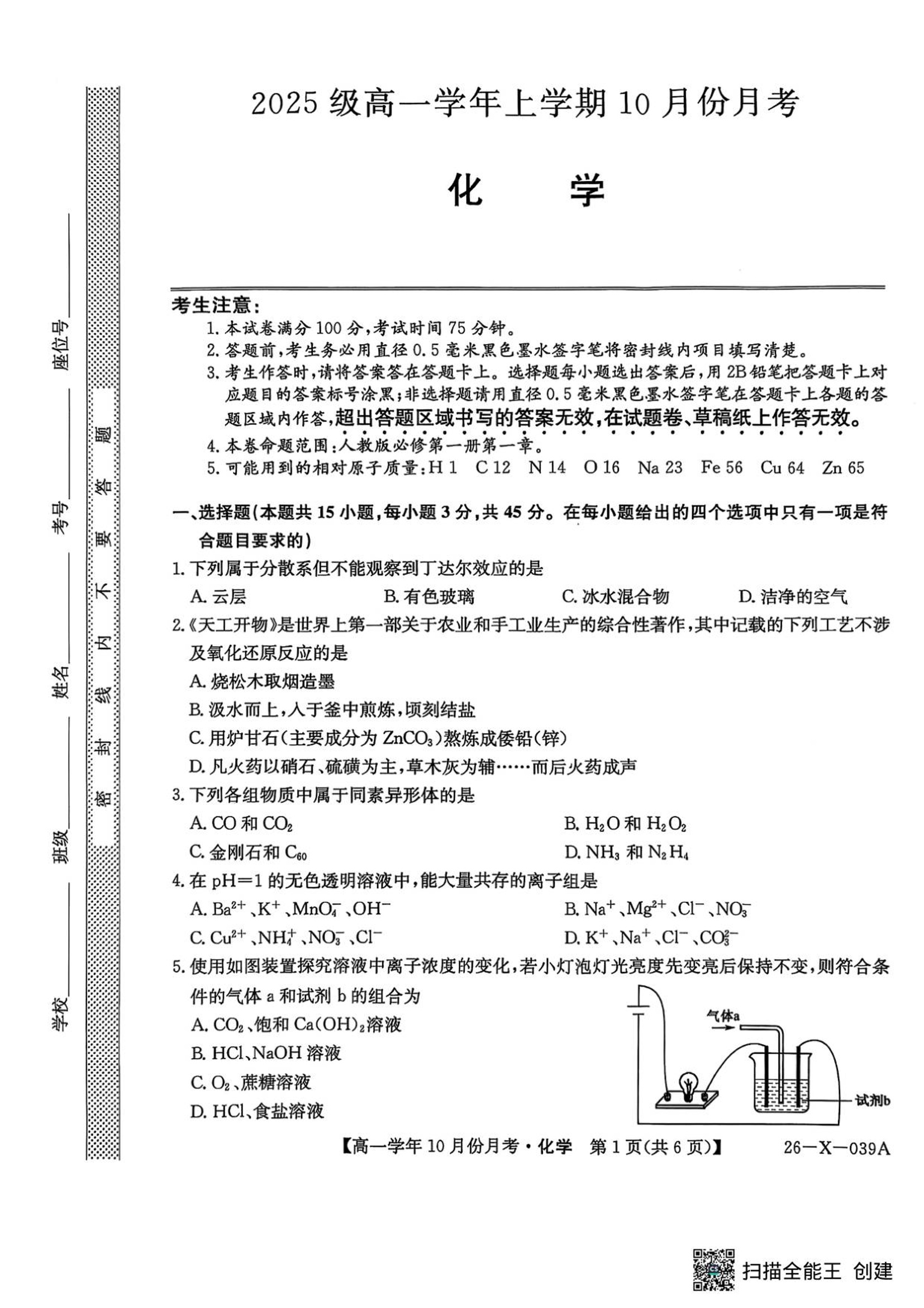 高一化学--黑龙江省龙东联盟2025-2026学年高一上学期10月月考