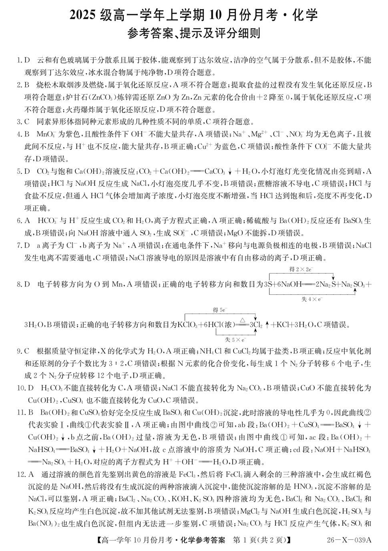 高一化学答案--黑龙江省龙东联盟2025-2026学年高一上学期10月月考