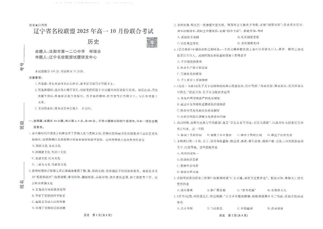 高一历史--辽宁省名校联盟2025年高一10月份联合考试