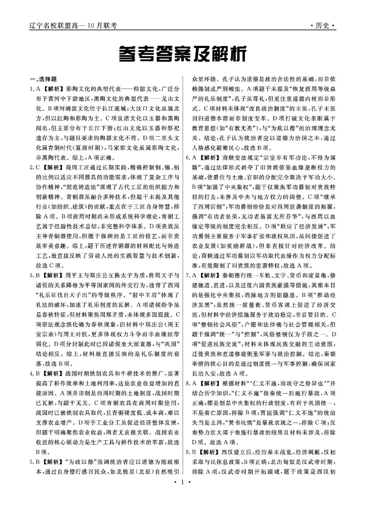 高一历史答案--辽宁省名校联盟2025年高一10月份联合考试