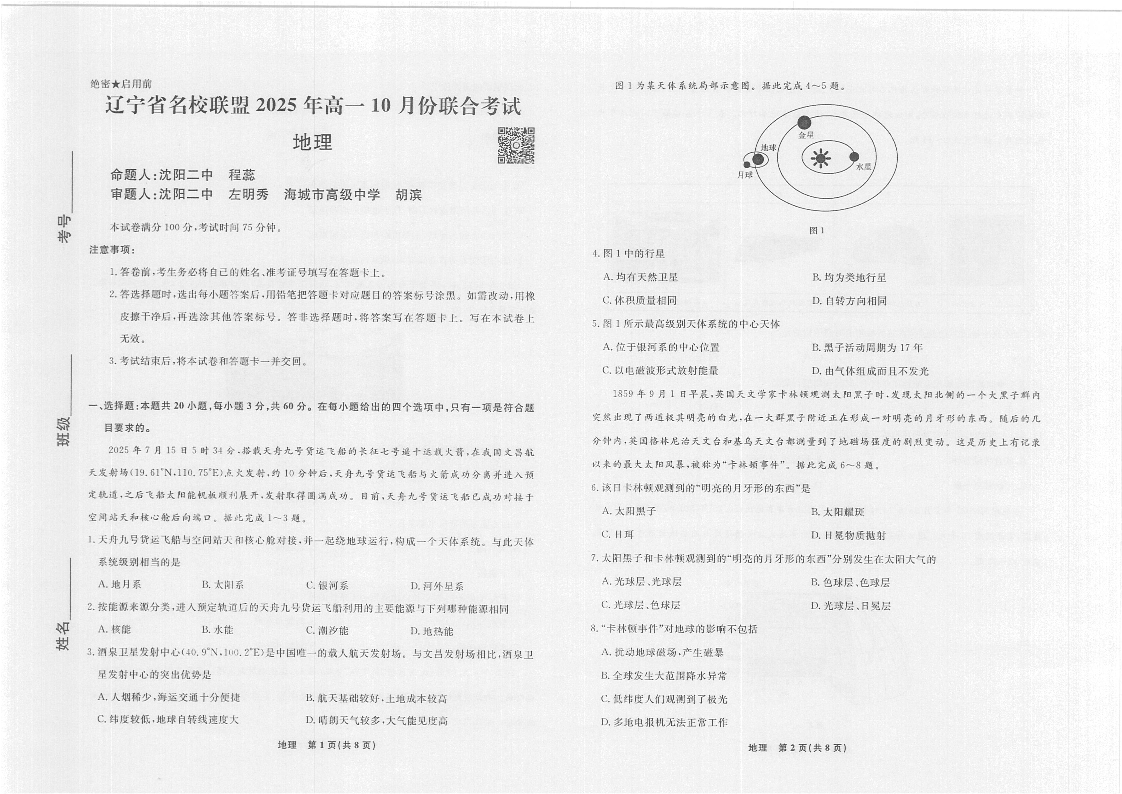 高一地理--辽宁省名校联盟2025年高一10月份联合考试