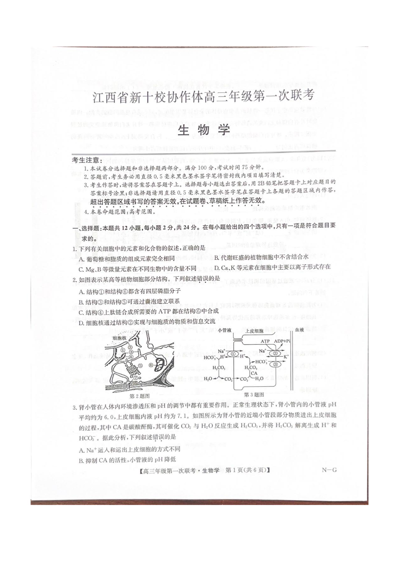 高三生物+答案--江西省九师联盟新十校协作体2026届高三上学期第一次联考