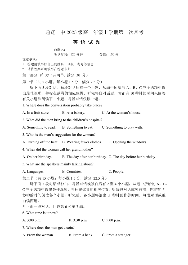 高一英语--内蒙古通辽市第一中学2025-2026学年高一上学期第一次月考