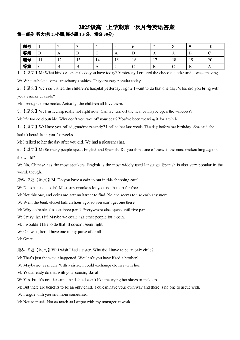 高一英语答案--内蒙古通辽市第一中学2025-2026学年高一上学期第一次月考