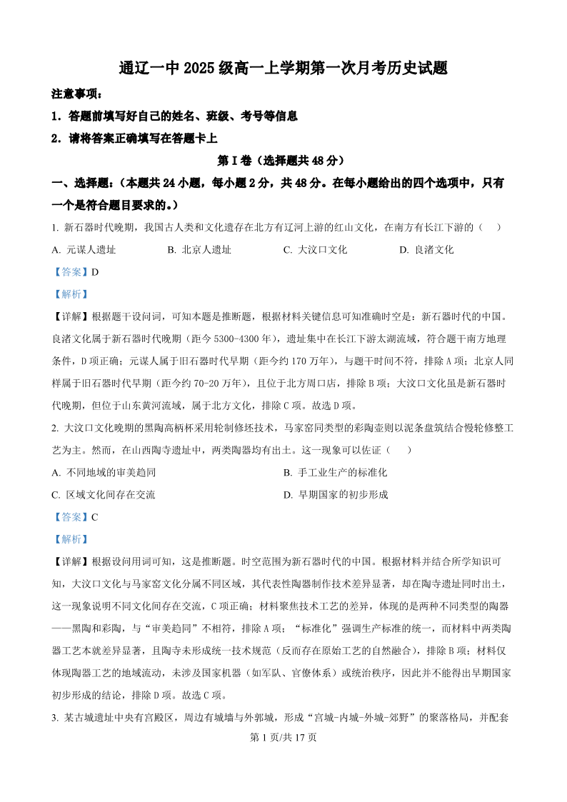 高一历史(精品解析版)--内蒙古通辽市第一中学2025-2026学年高一上学期第一次月考