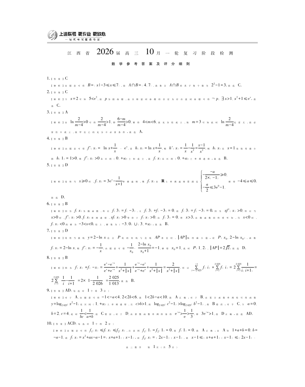 高三数学答案--江西省上进联考2026届高三10月一轮复习阶段检测