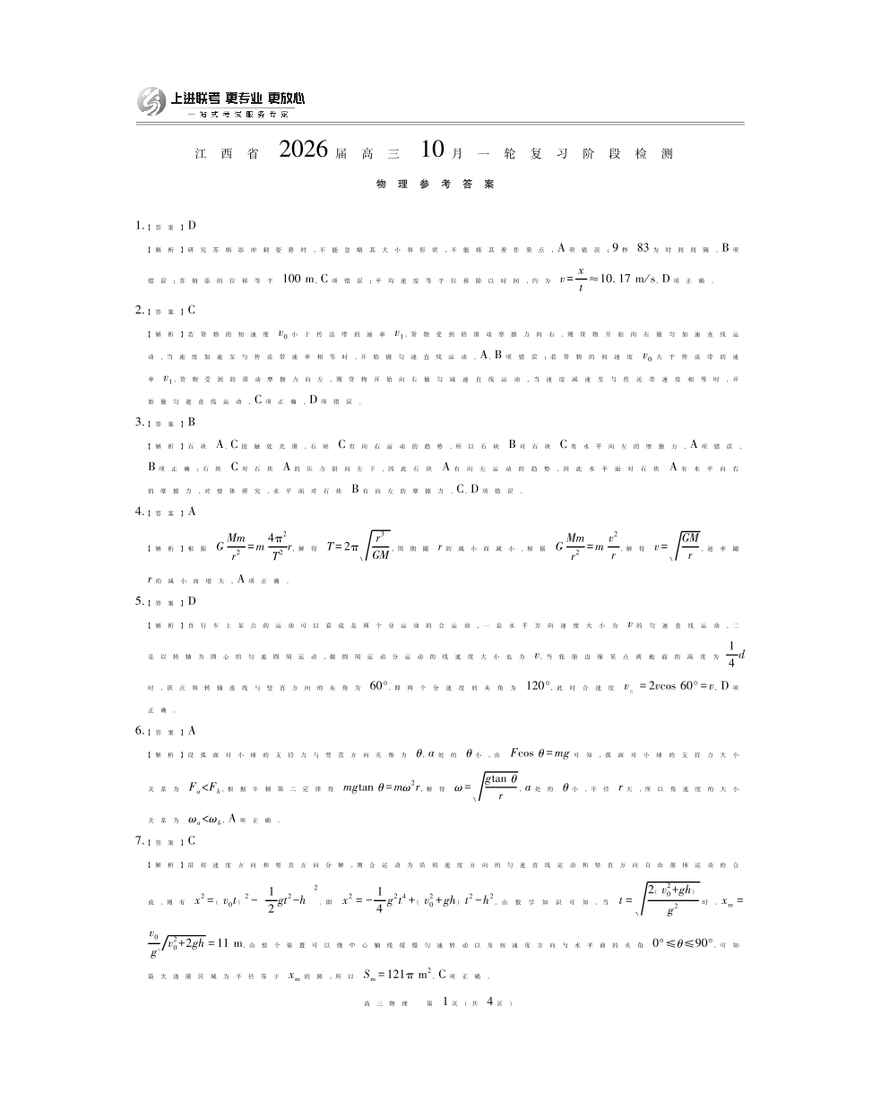 高三物理答案--江西省上进联考2026届高三10月一轮复习阶段检测