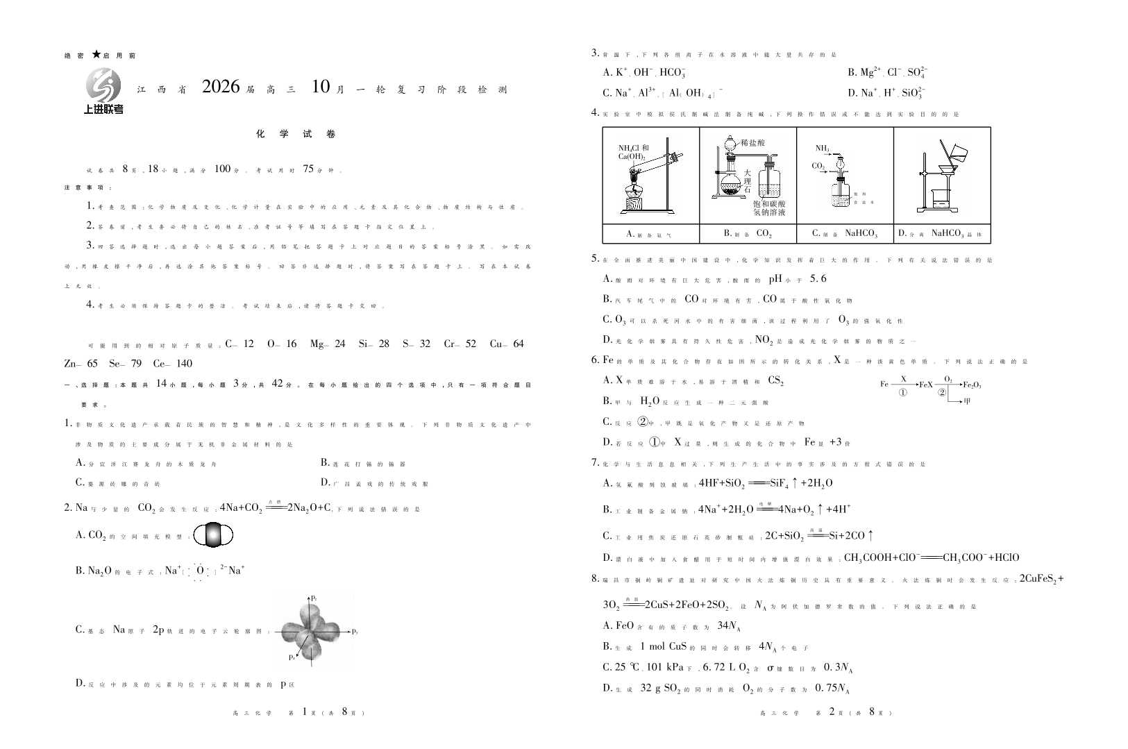 高三化学--江西省上进联考2026届高三10月一轮复习阶段检测