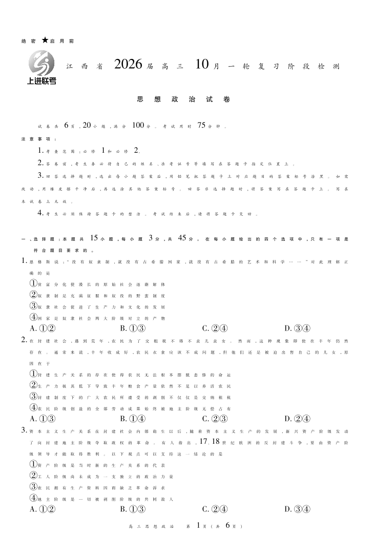 高三政治--江西省上进联考2026届高三10月一轮复习阶段检测