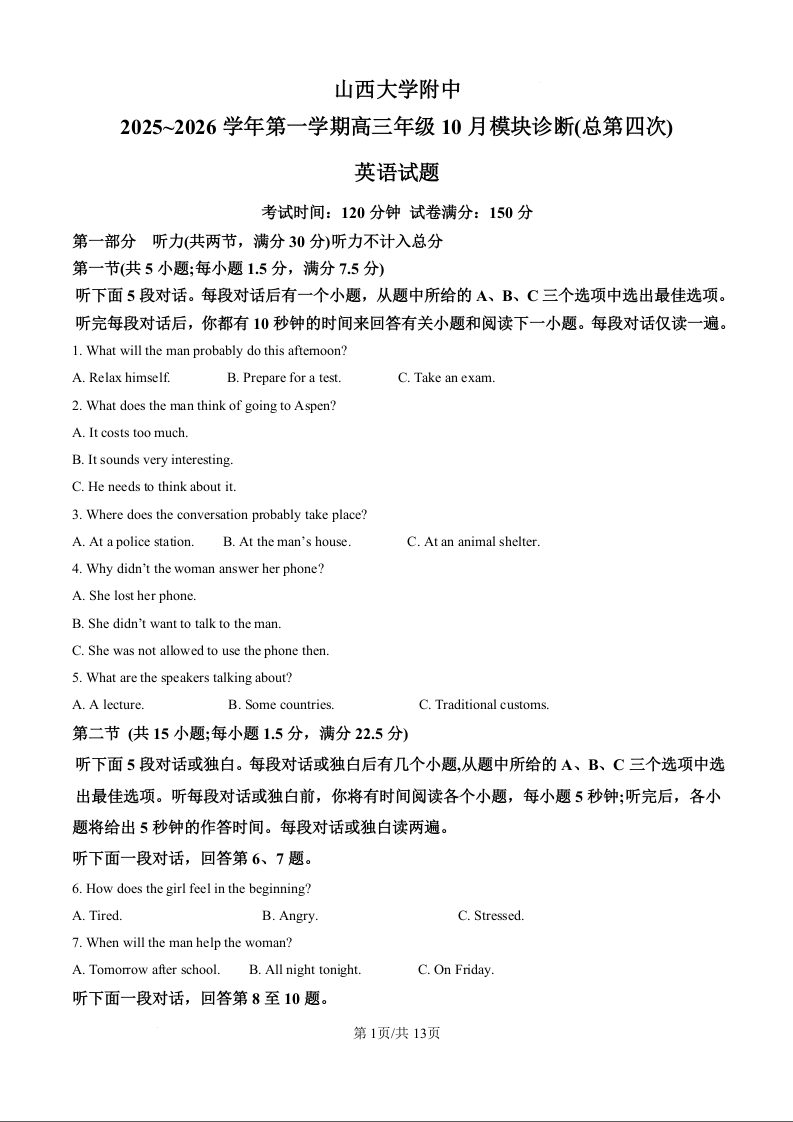 高三英语(原卷版)--山西大学附属中学校2026届高三上学期10月模块诊断(总第四次)
