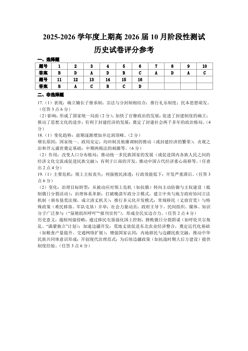 高三历史答案--四川省成都市第七中学2026届高三上学期10月月考