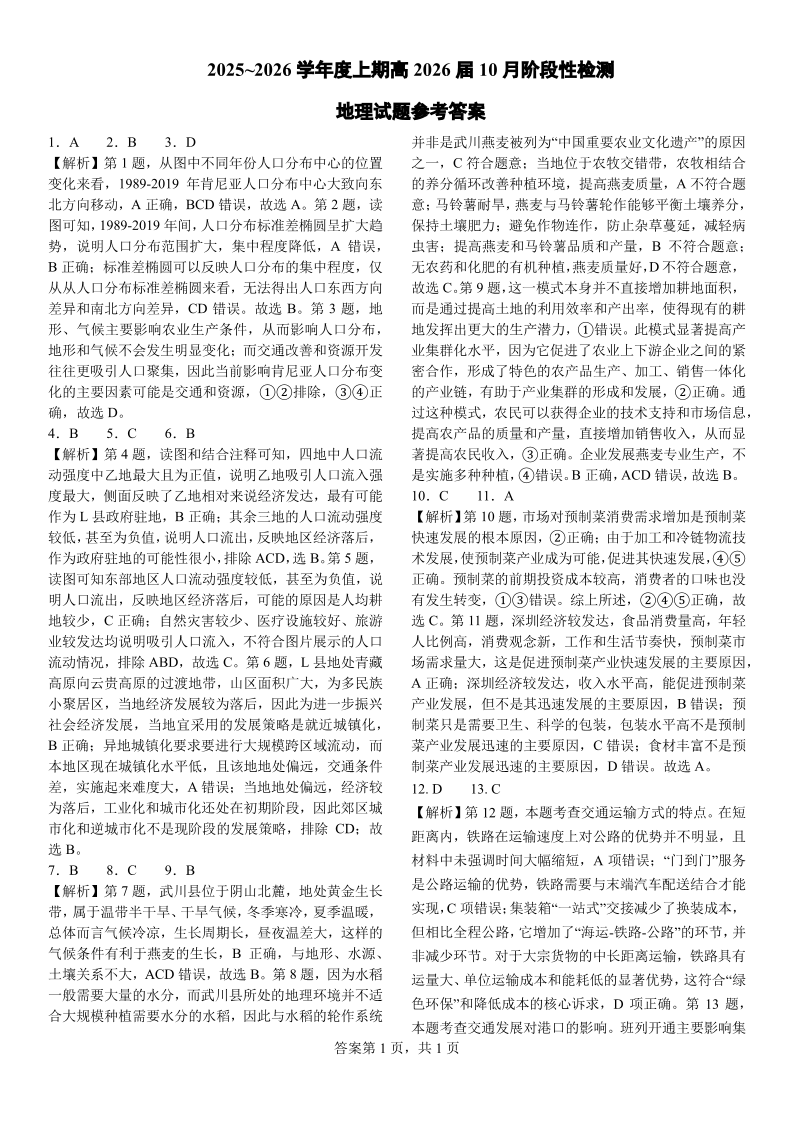 高三地理答案--四川省成都市第七中学2026届高三上学期10月月考