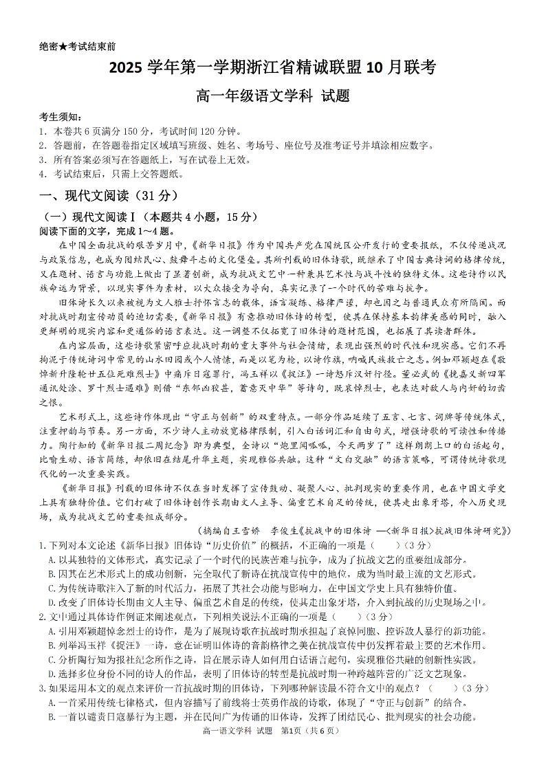 高一语文--浙江精诚联盟2025-2026学年高一上学期10月联考