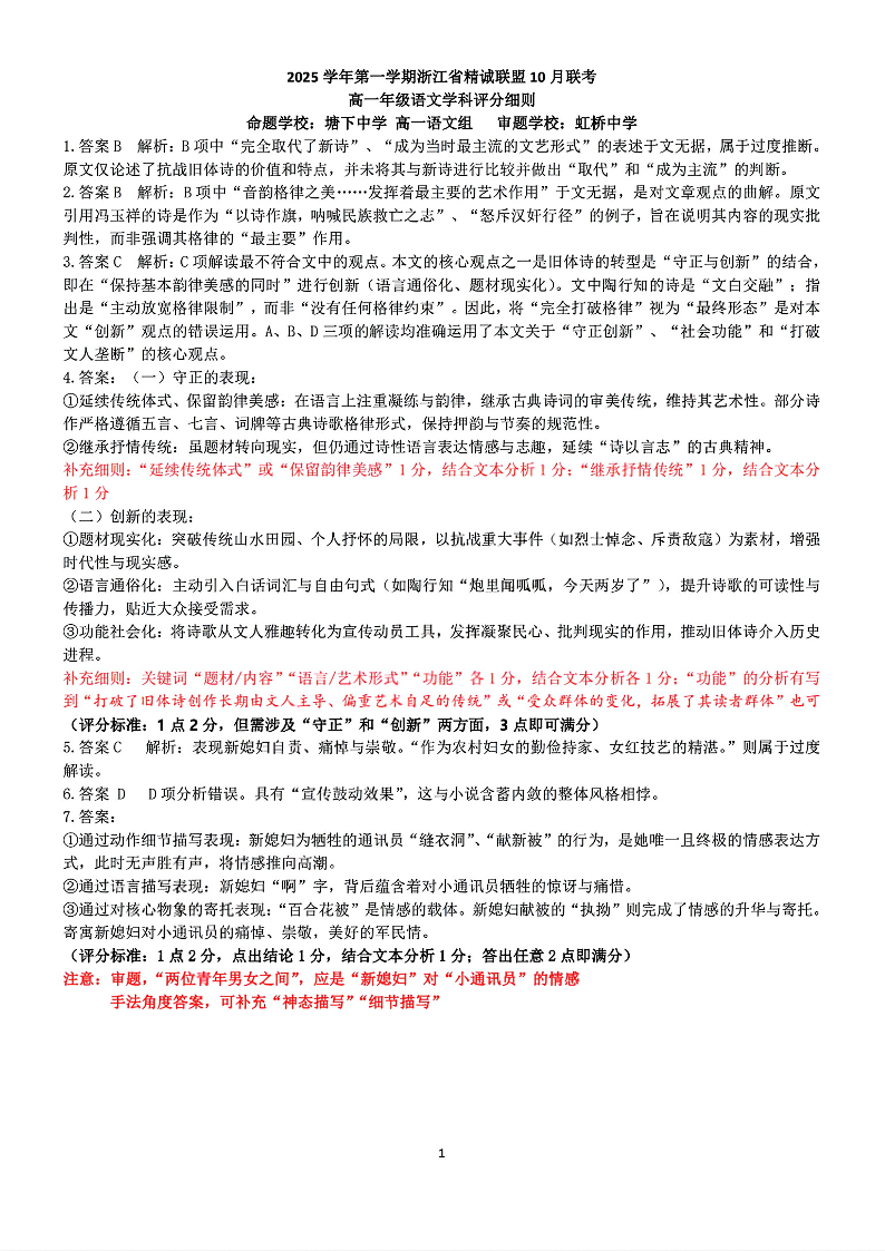 高一语文答案--浙江精诚联盟2025-2026学年高一上学期10月联考