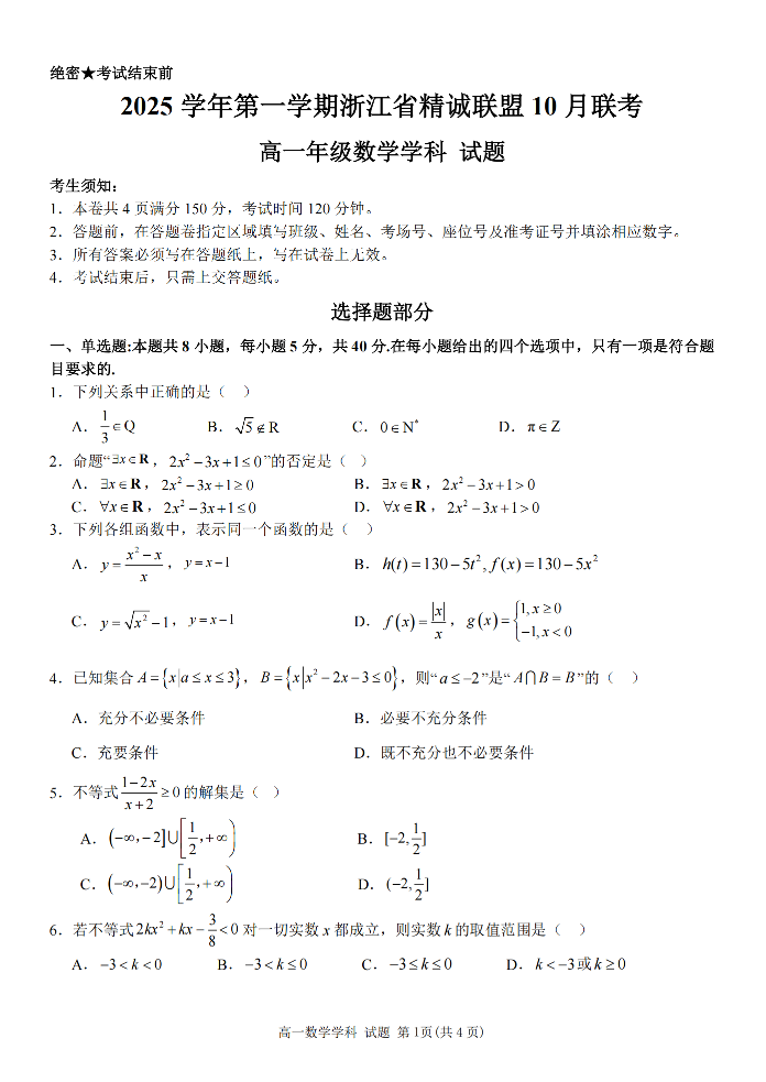 高一数学--浙江精诚联盟2025-2026学年高一上学期10月联考