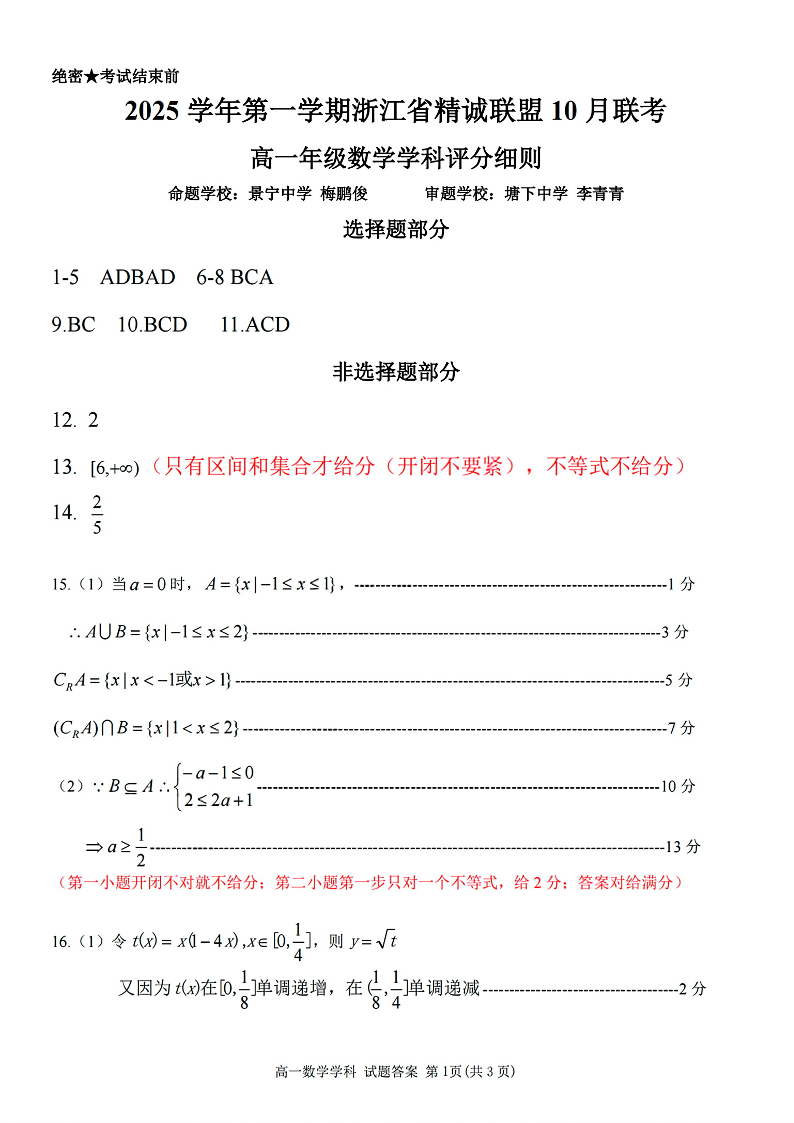 高一数学答案--浙江精诚联盟2025-2026学年高一上学期10月联考
