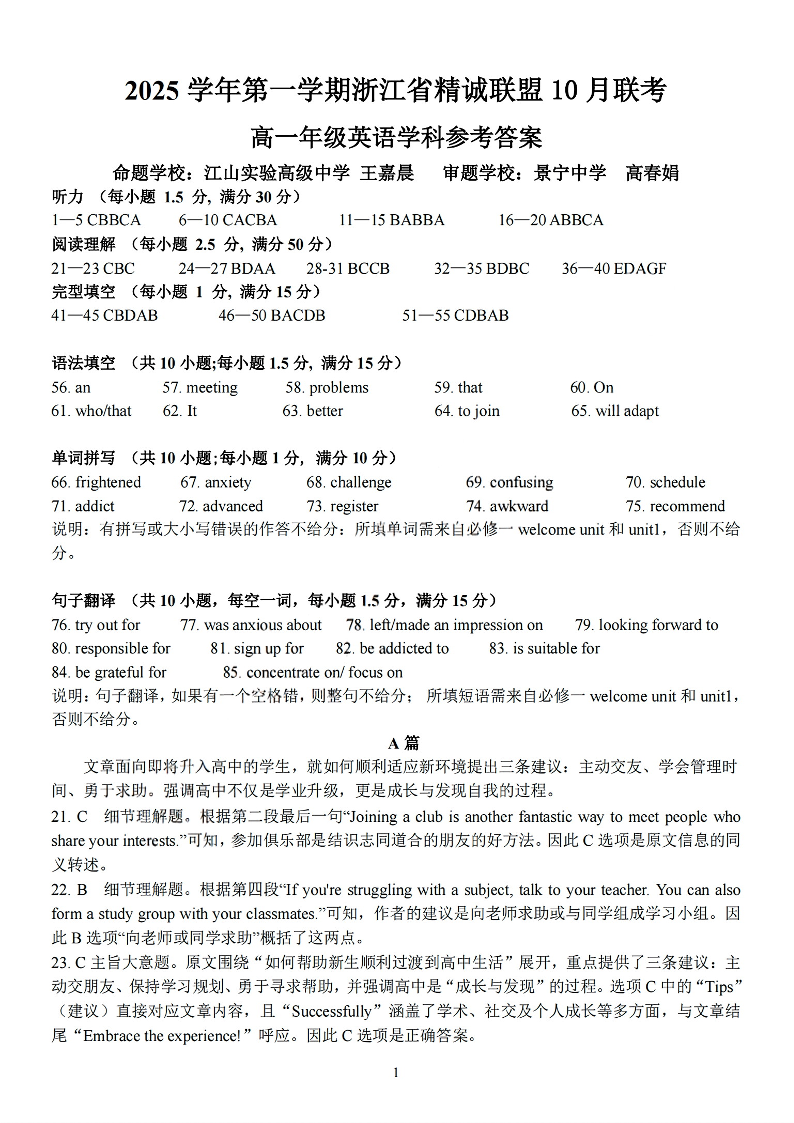 高一英语答案--浙江精诚联盟2025-2026学年高一上学期10月联考