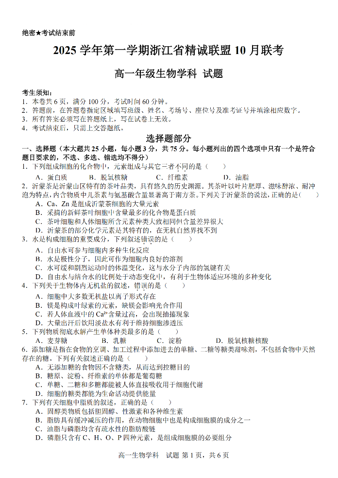 高一生物--浙江精诚联盟2025-2026学年高一上学期10月联考