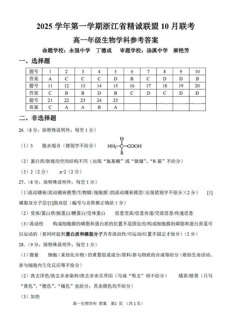 高一生物答案--浙江精诚联盟2025-2026学年高一上学期10月联考