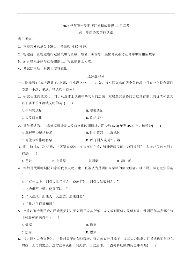高一历史+答案--浙江精诚联盟2025-2026学年高一上学期10月联考