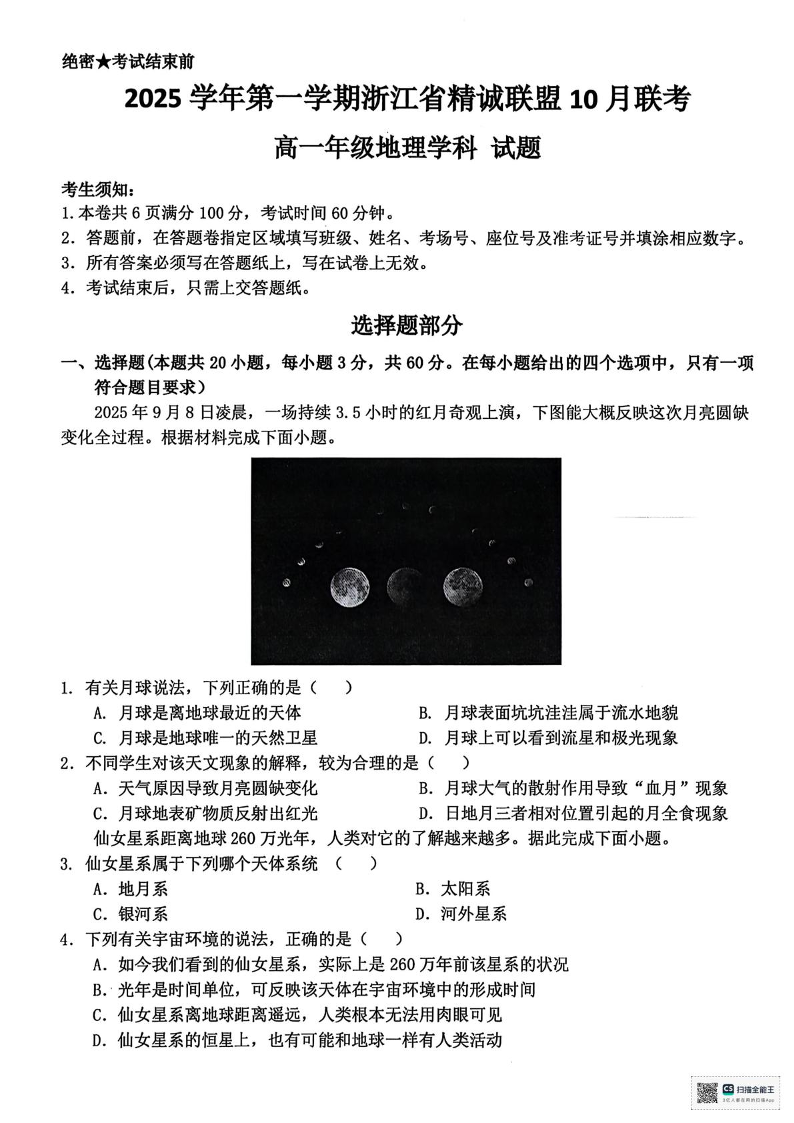 高一地理+答案--浙江精诚联盟2025-2026学年高一上学期10月联考