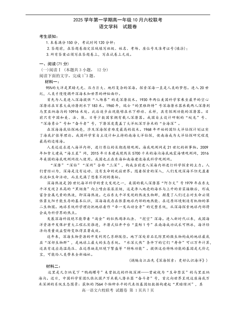 高一语文--浙江省六校联盟2025-2026学年高一上学期10月月考