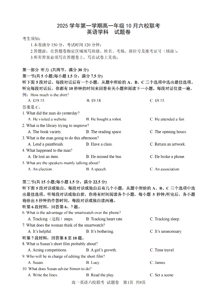 高一英语--浙江省六校联盟2025-2026学年高一上学期10月月考