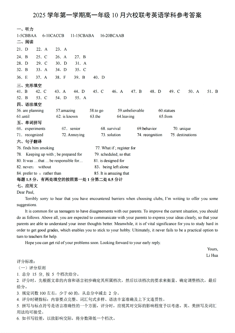 高一英语答案--浙江省六校联盟2025-2026学年高一上学期10月月考