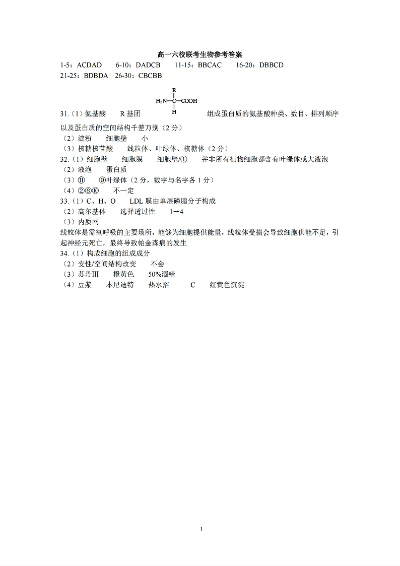 高一生物答案--浙江省六校联盟2025-2026学年高一上学期10月月考