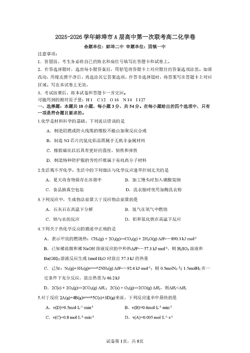 高二化学+答案--安徽省蚌埠市A层高中2025-2026学年高二上学期10月月考