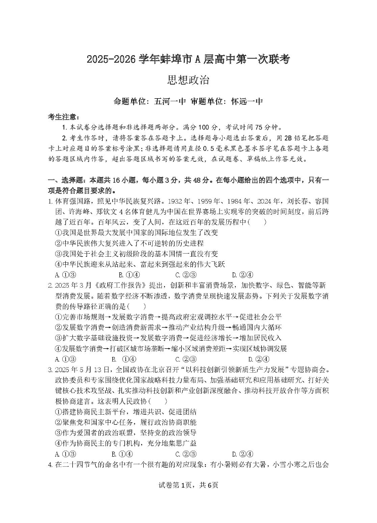 高二政治+答案--安徽省蚌埠市A层高中2025-2026学年高二上学期10月月考