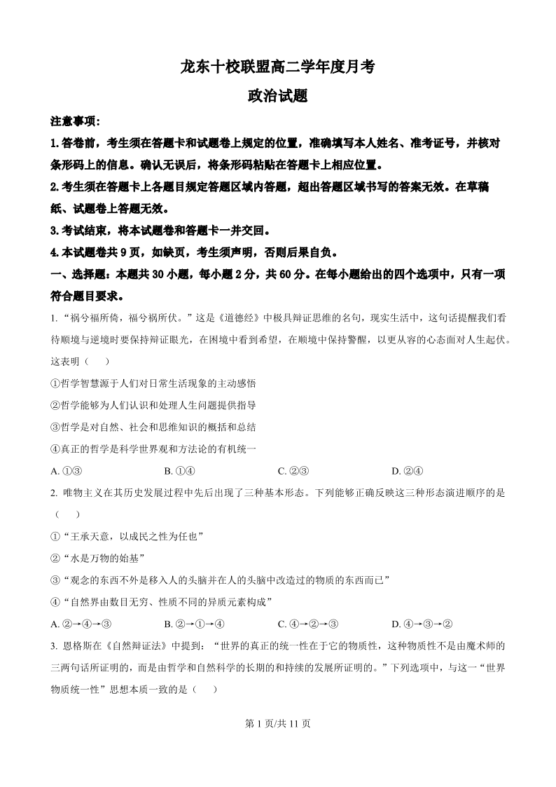 高二政治(原卷版)--黑龙江省龙东十校联盟2025-2026学年高二上学期10月月考