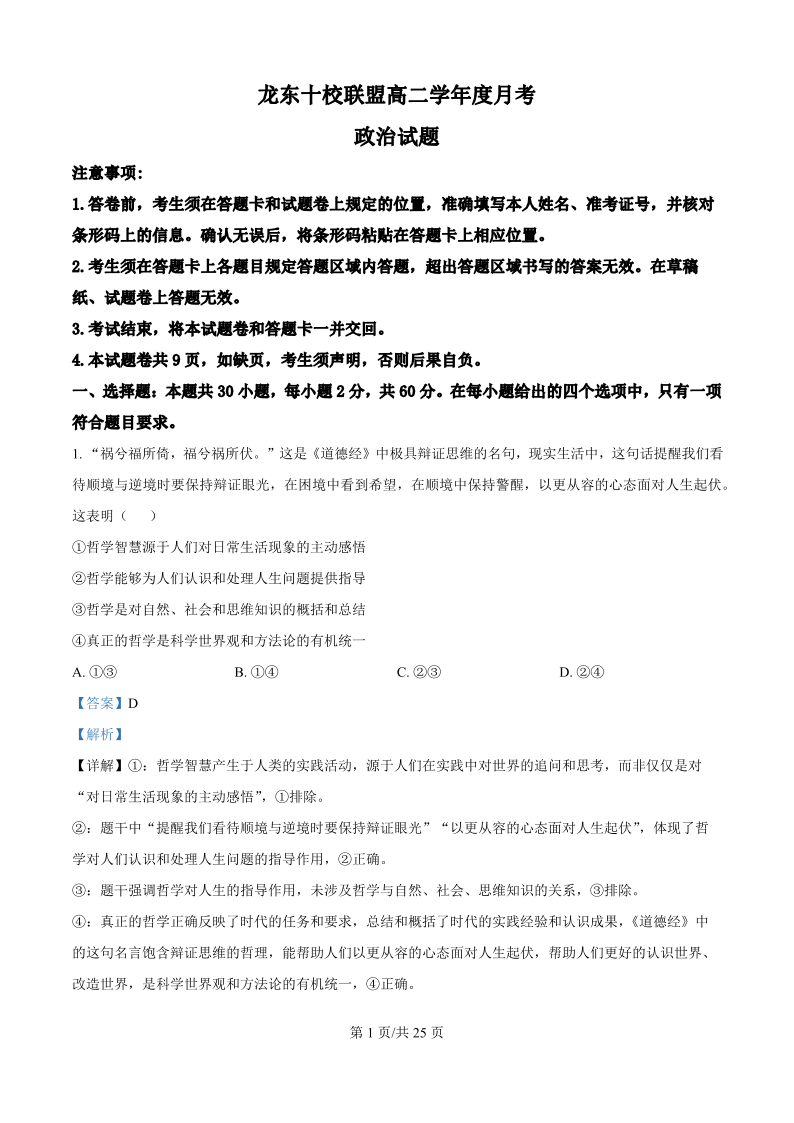高二政治(精品解析版)--黑龙江省龙东十校联盟2025-2026学年高二上学期10月月考