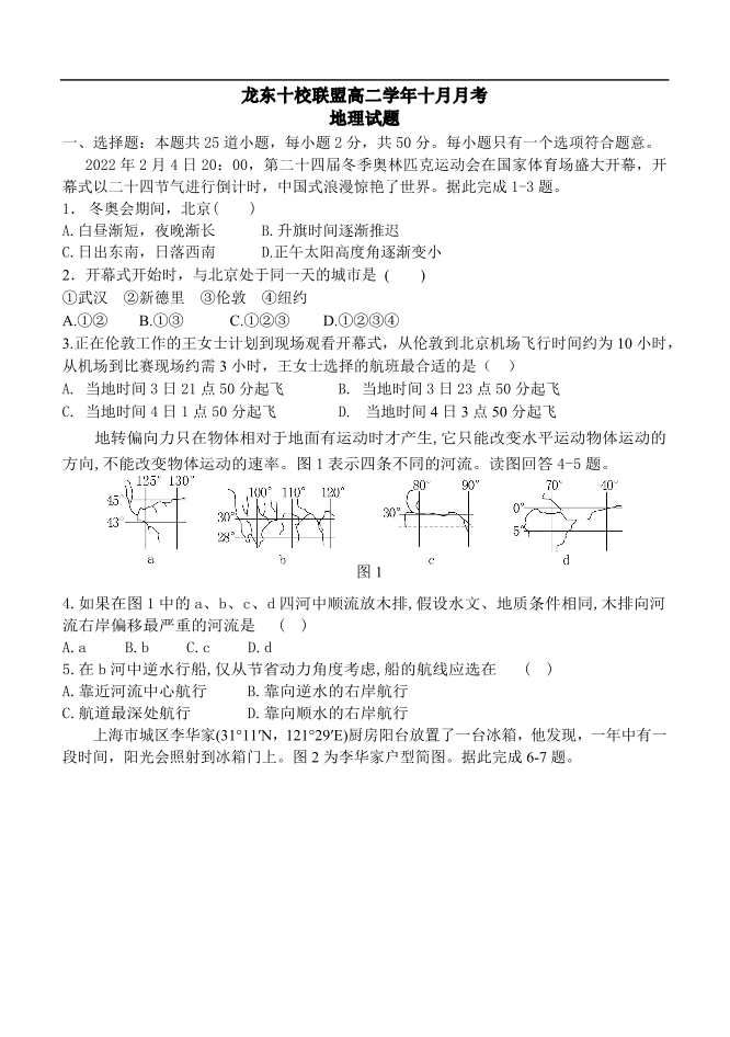高二地理--黑龙江省龙东十校联盟2025-2026学年高二上学期10月月考