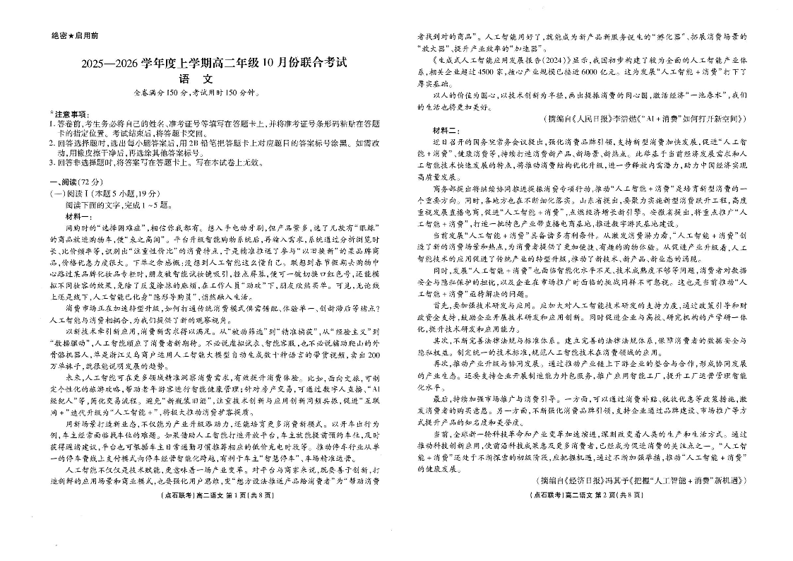高二语文+答案--高二化学--辽宁省点石联考2025-2026学年高二上学期10月月考
