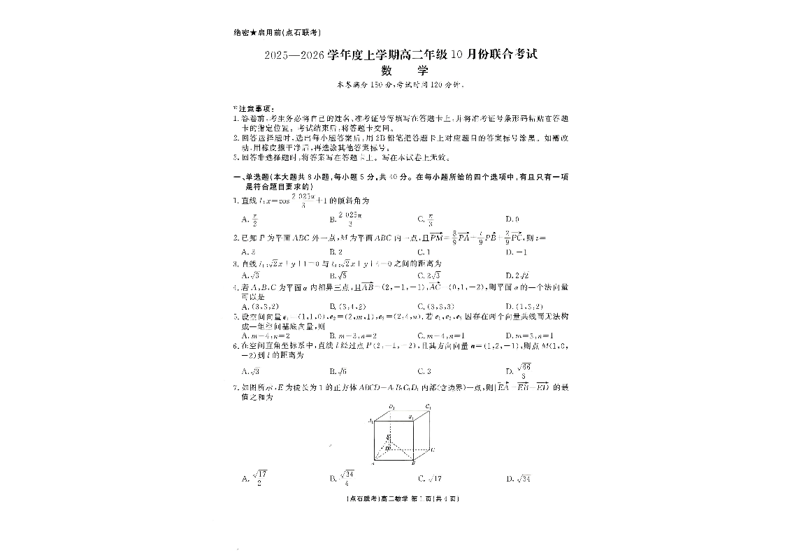 高二数学+答案--高二化学--辽宁省点石联考2025-2026学年高二上学期10月月考
