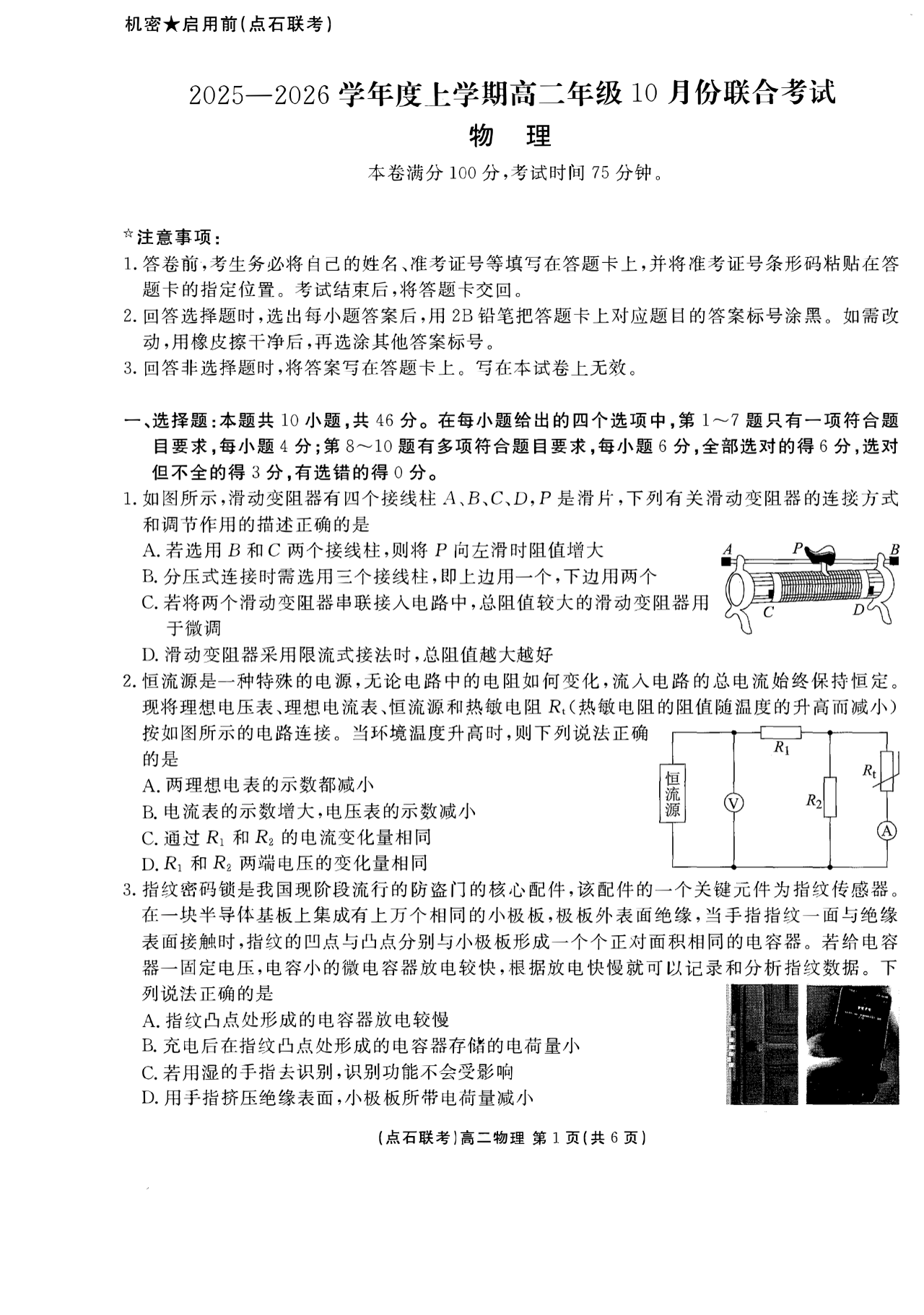 高二物理+答案--高二化学--辽宁省点石联考2025-2026学年高二上学期10月月考