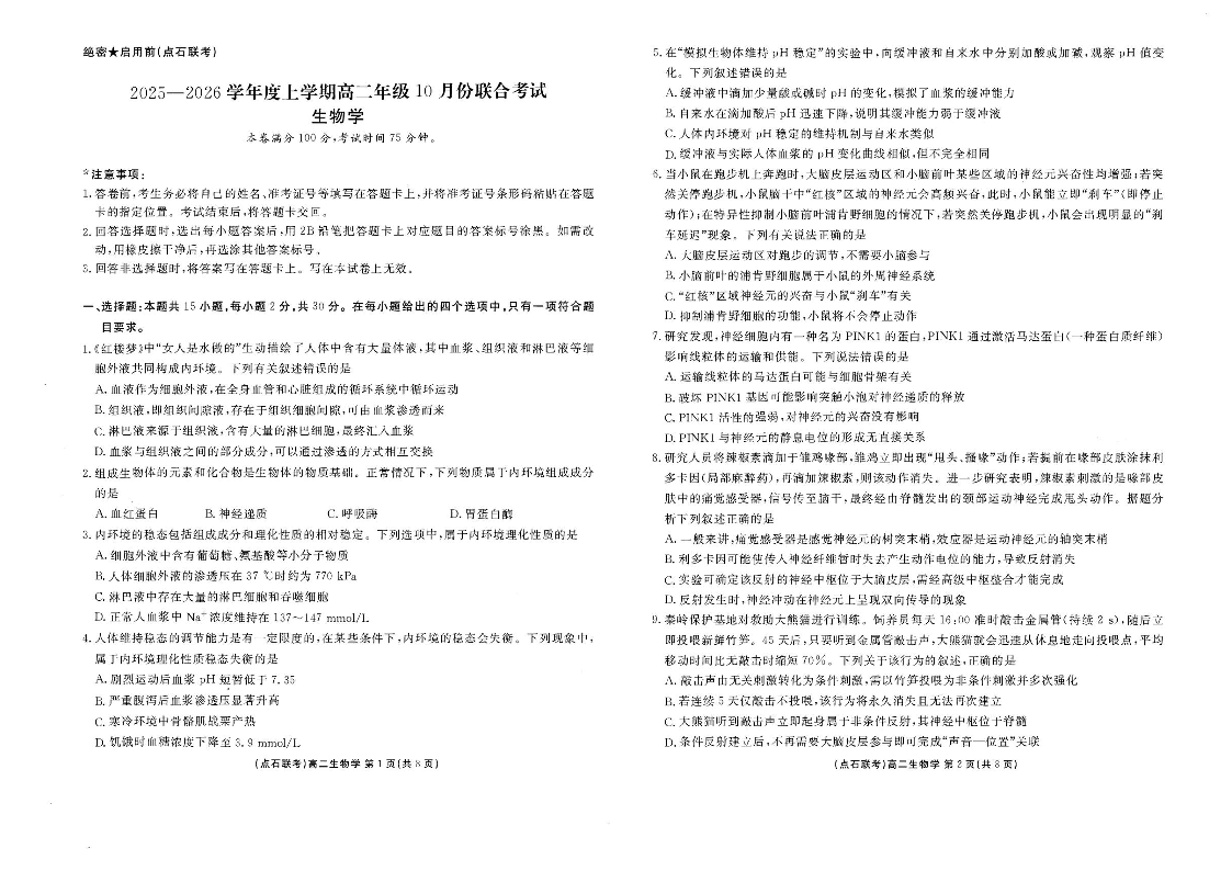 高二生物+答案--高二化学--辽宁省点石联考2025-2026学年高二上学期10月月考