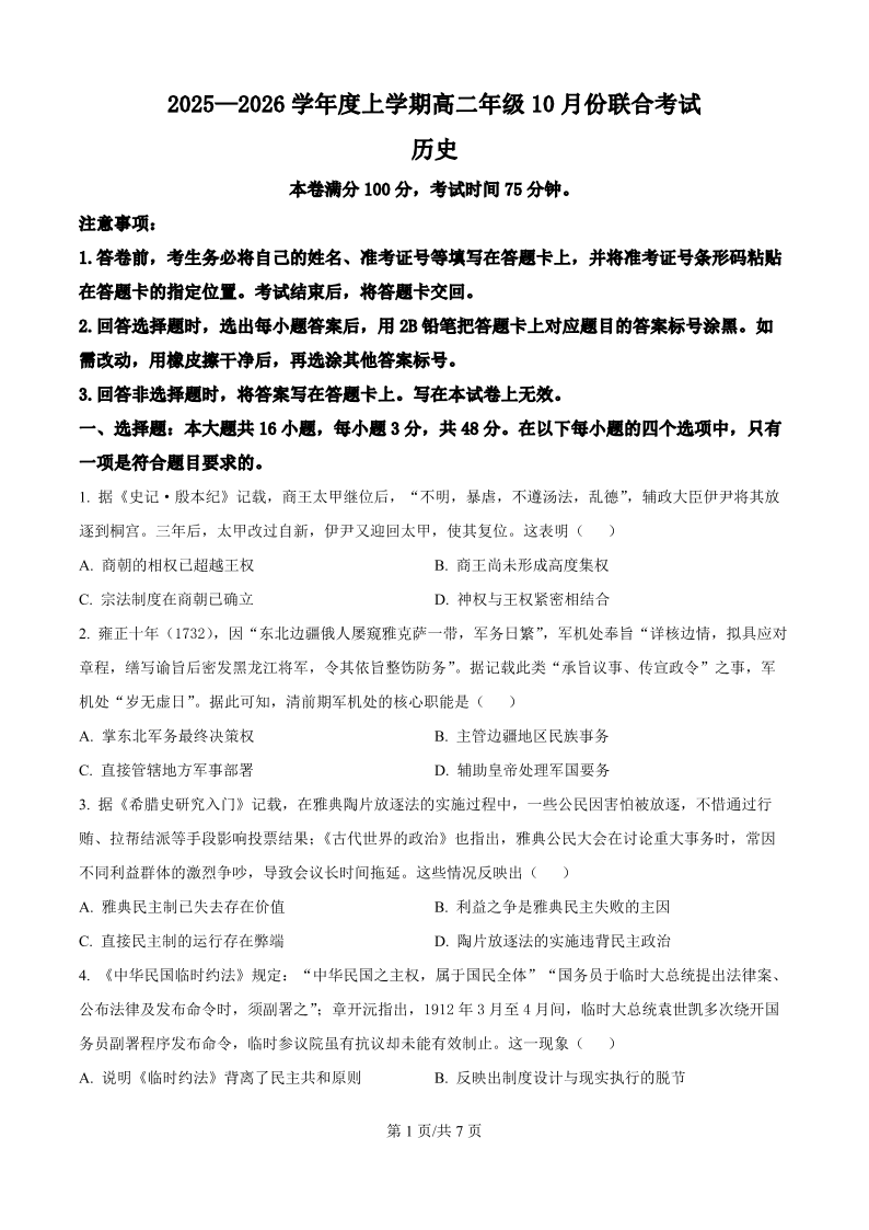 高二历史(原卷版)--高二化学--辽宁省点石联考2025-2026学年高二上学期10月月考